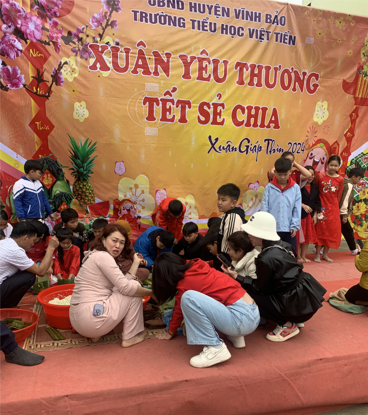 Hòa chung trong không khí rộn rã của những ngày Tết Nguyên đán Giáp Thìn đang đến gần, Sáng ngày 2/2/2024, BGH, các cô giáo và các cháu học sinh trường Tiểu học Việt Tiến đã phối hợp với hội phụ huynh học sinh tổ chức hoạt động trải nghiệm "Gói bánh chưng, bánh tết ngày tết”. Cô trò và các bậc phụ huynh cùng tất bật cho công tác chuẩn bị: những chiếc lá dong, lá chuối được rửa sạch sẽ, lau khô, khuôn gói bánh, những nguyên liệu cần thiết gồm: Gạo nếp, lá dong, đỗ xanh, lá dứa và thịt lợn đã sẵn sàng cho hoạt động trải nghiệm mang đầy ý nghĩa này.